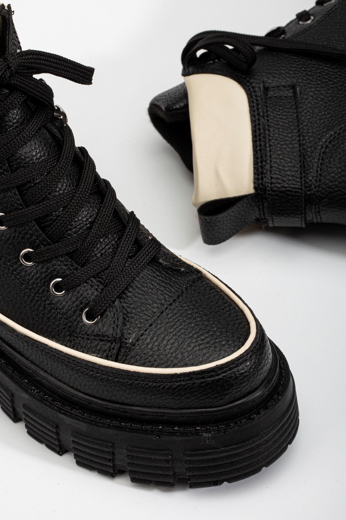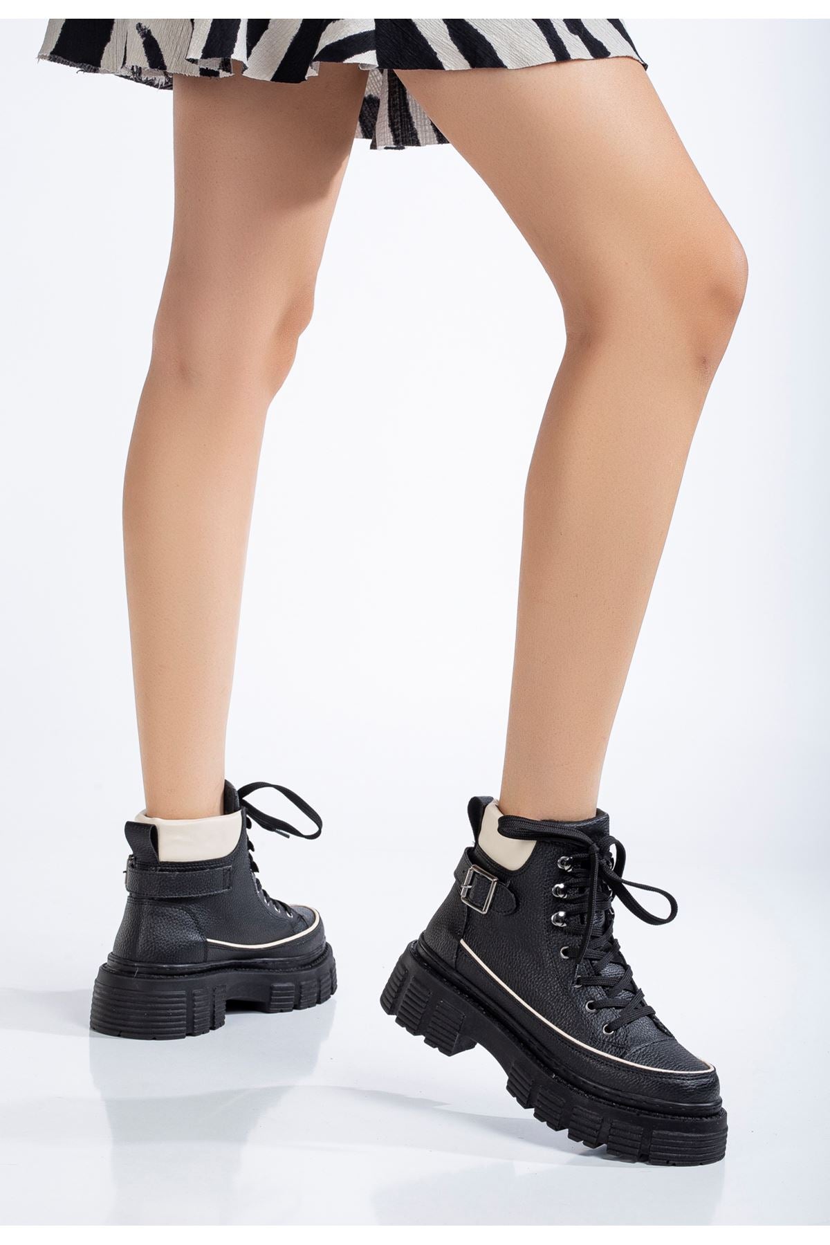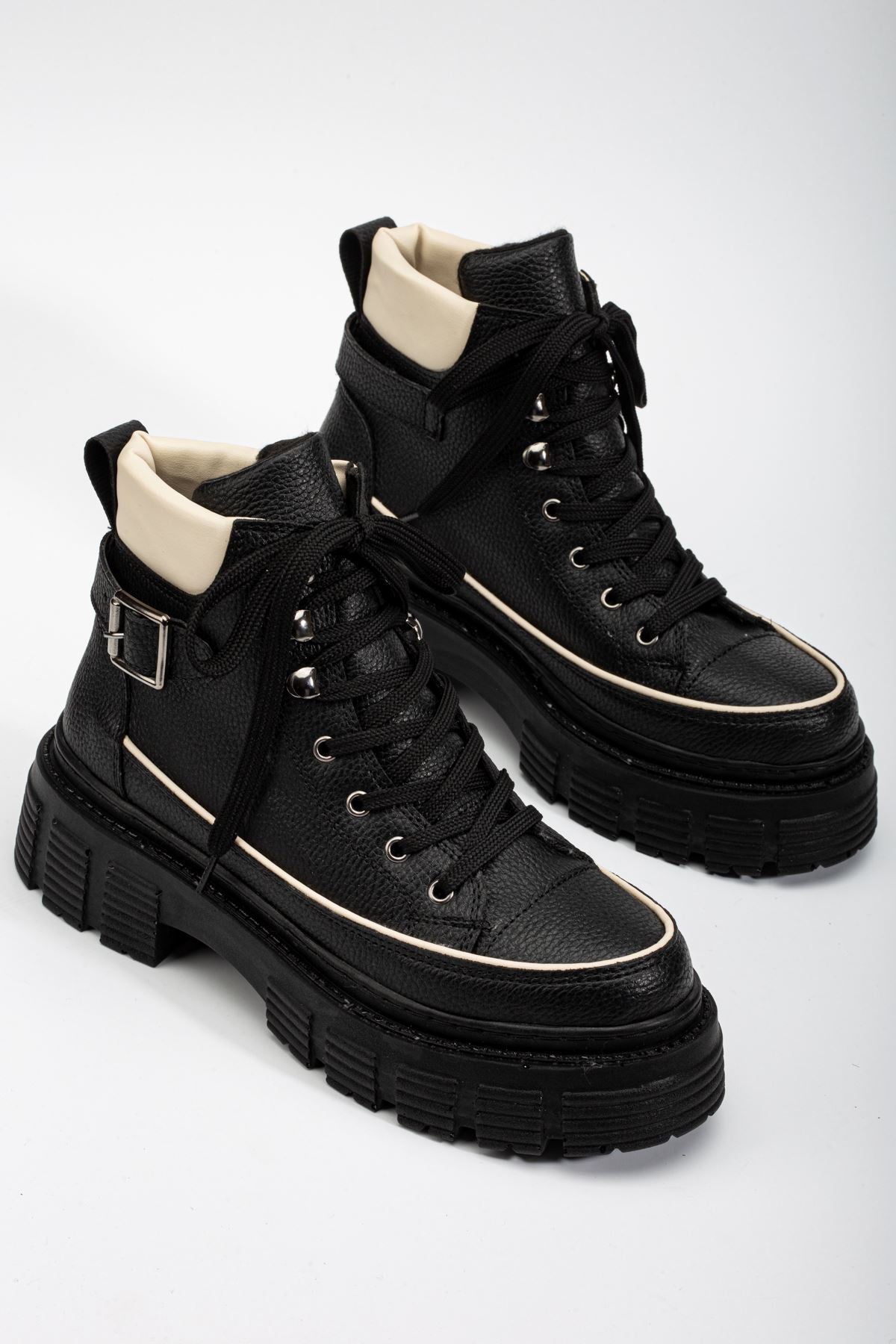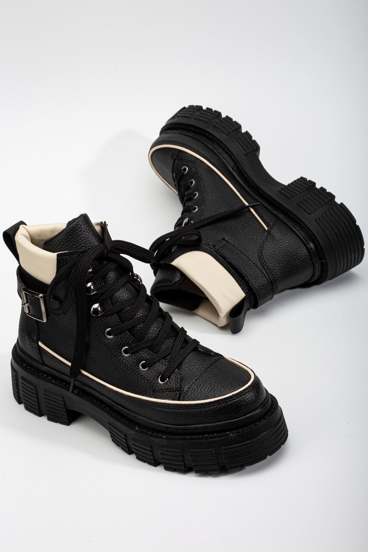 Black - Beige Buckle Detail Lace-Up Women's Boots