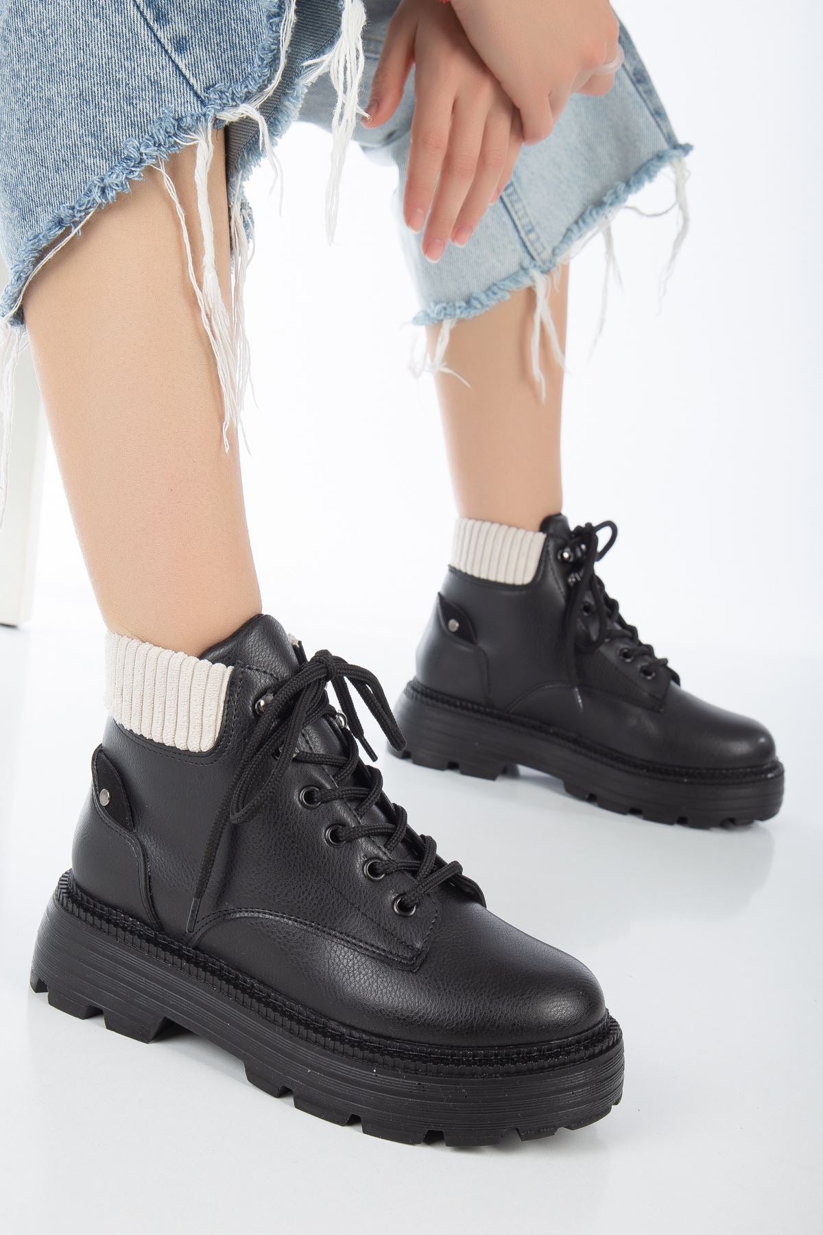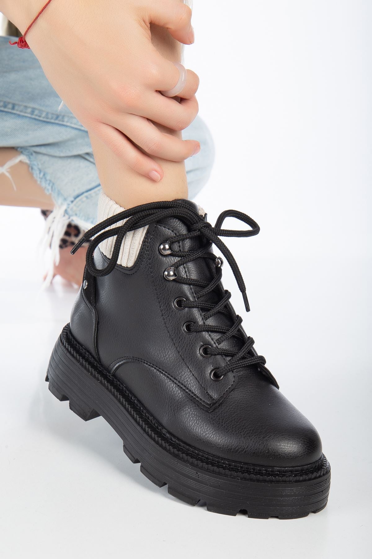 Black Leather Cat Lace Detail Women's Boots