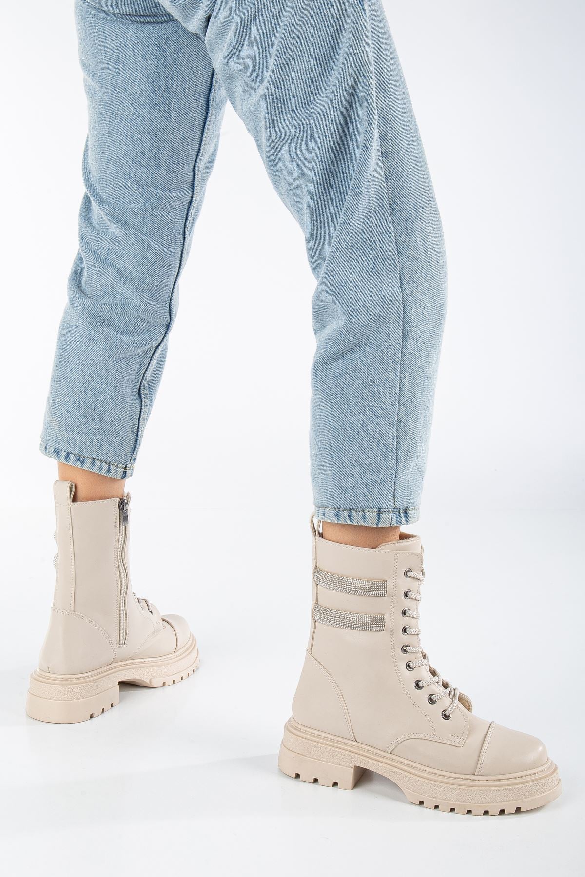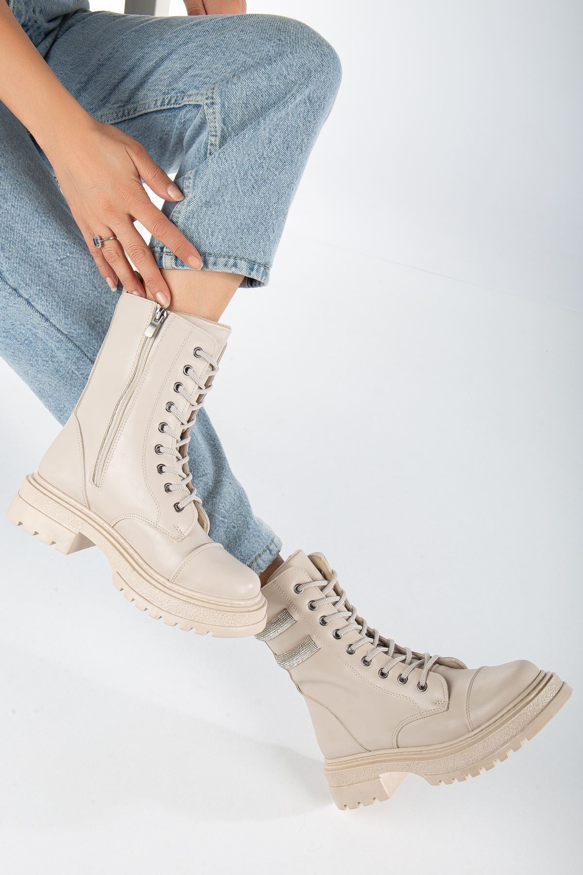 Cream Skin Stone Detailed Lace-Up Women's Boots