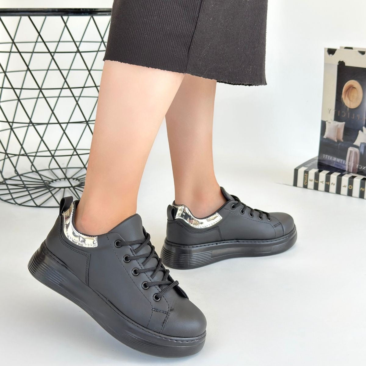 Women's Black Leather Lace-Up Sneakers
