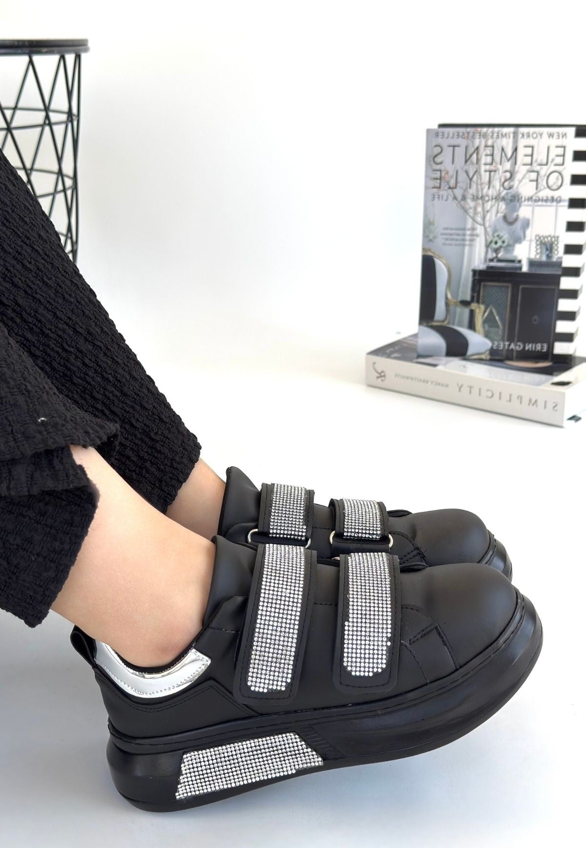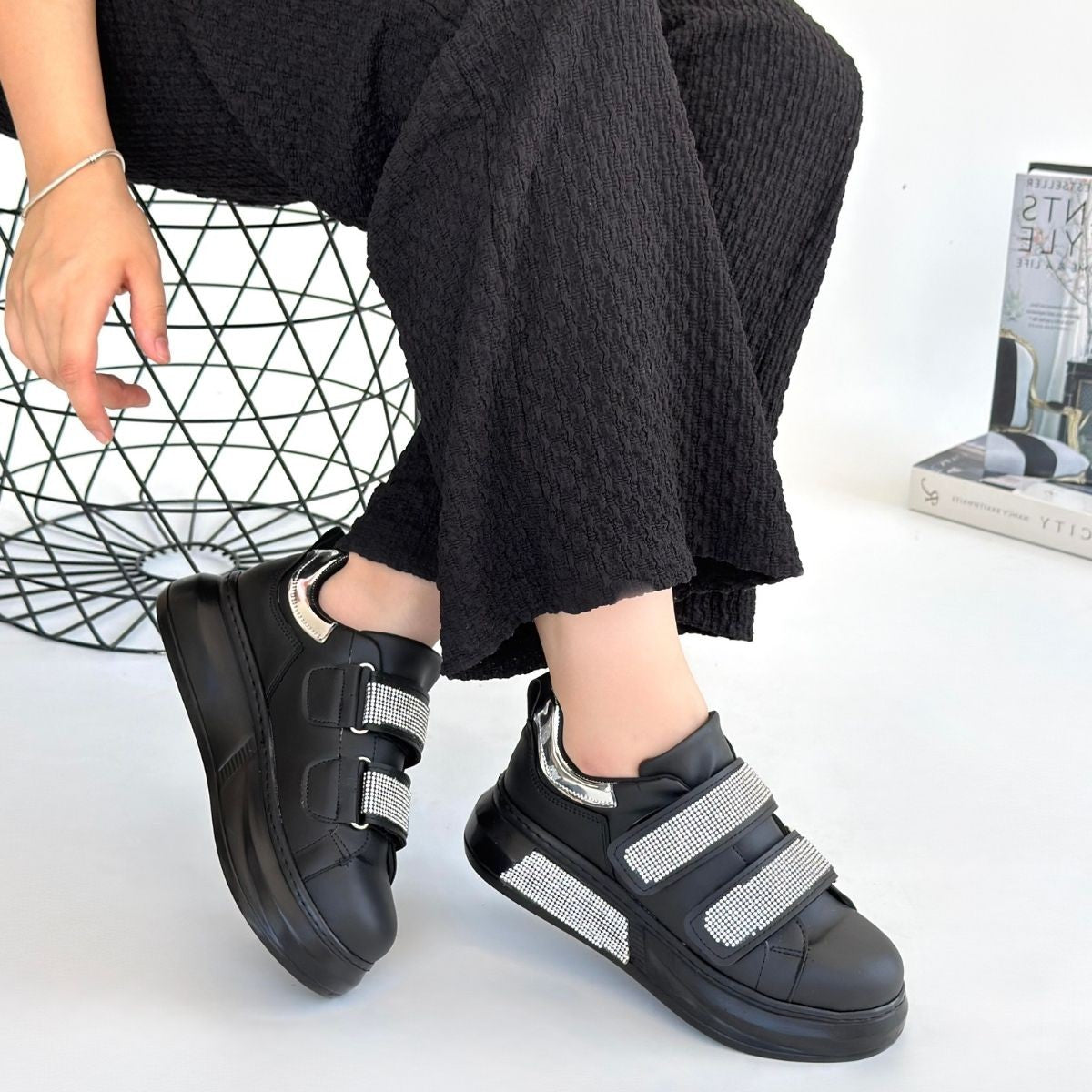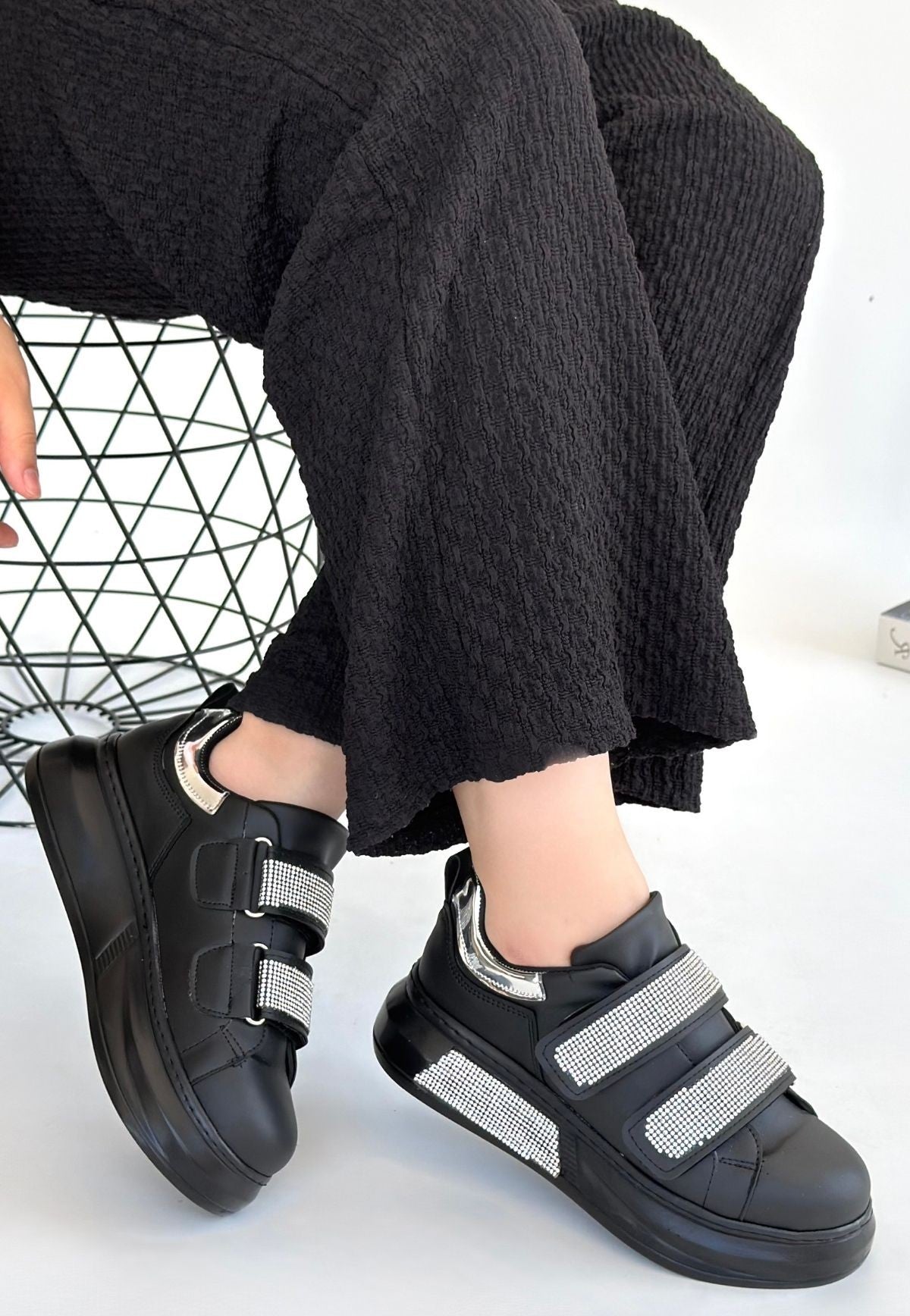 Women's Black Leather Velcro Sneakers