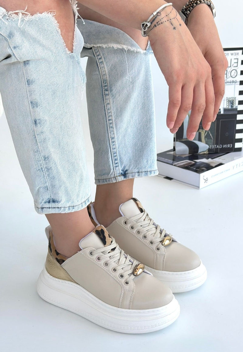 Women's Beige Skin Yellow Detailed Lace-Up Sneakers