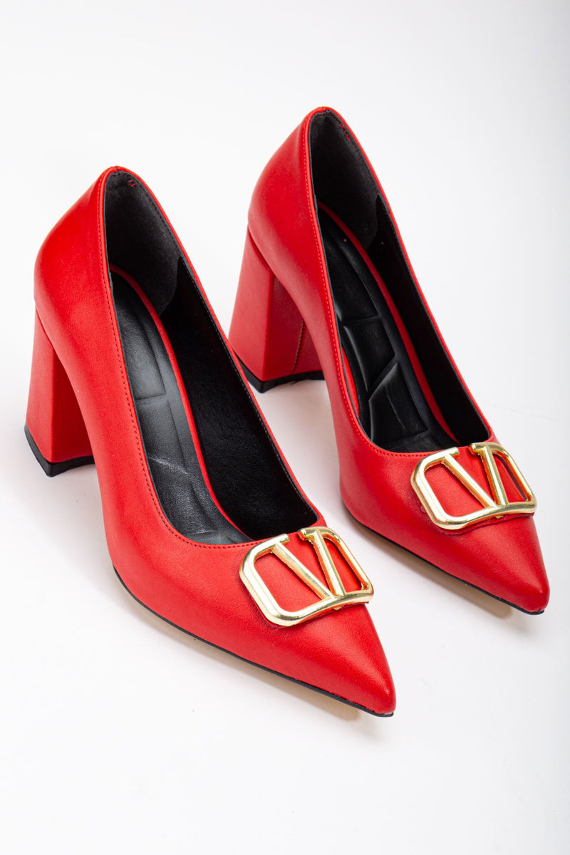 Red Leather Buckle Detailed Thick Heel Shoes