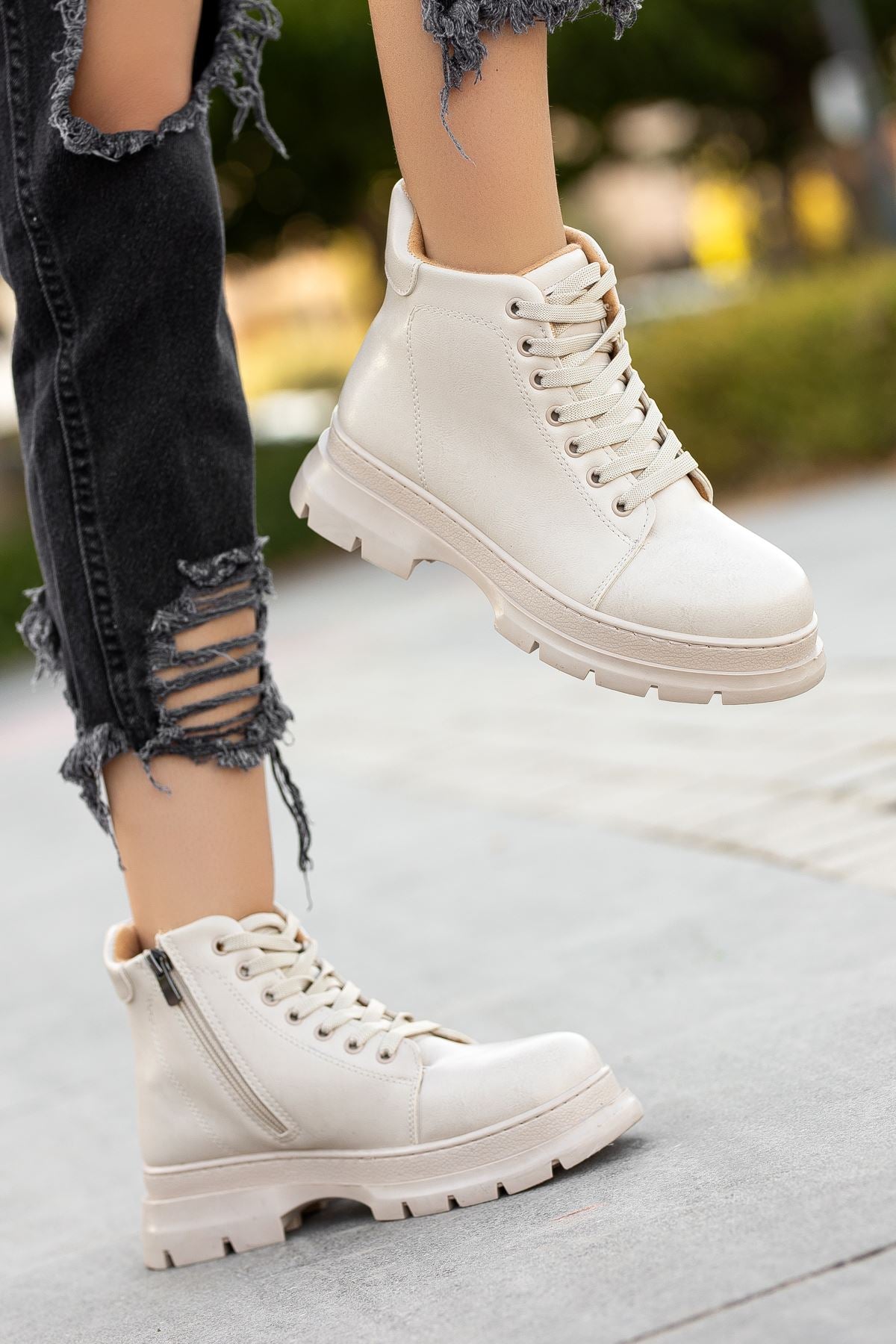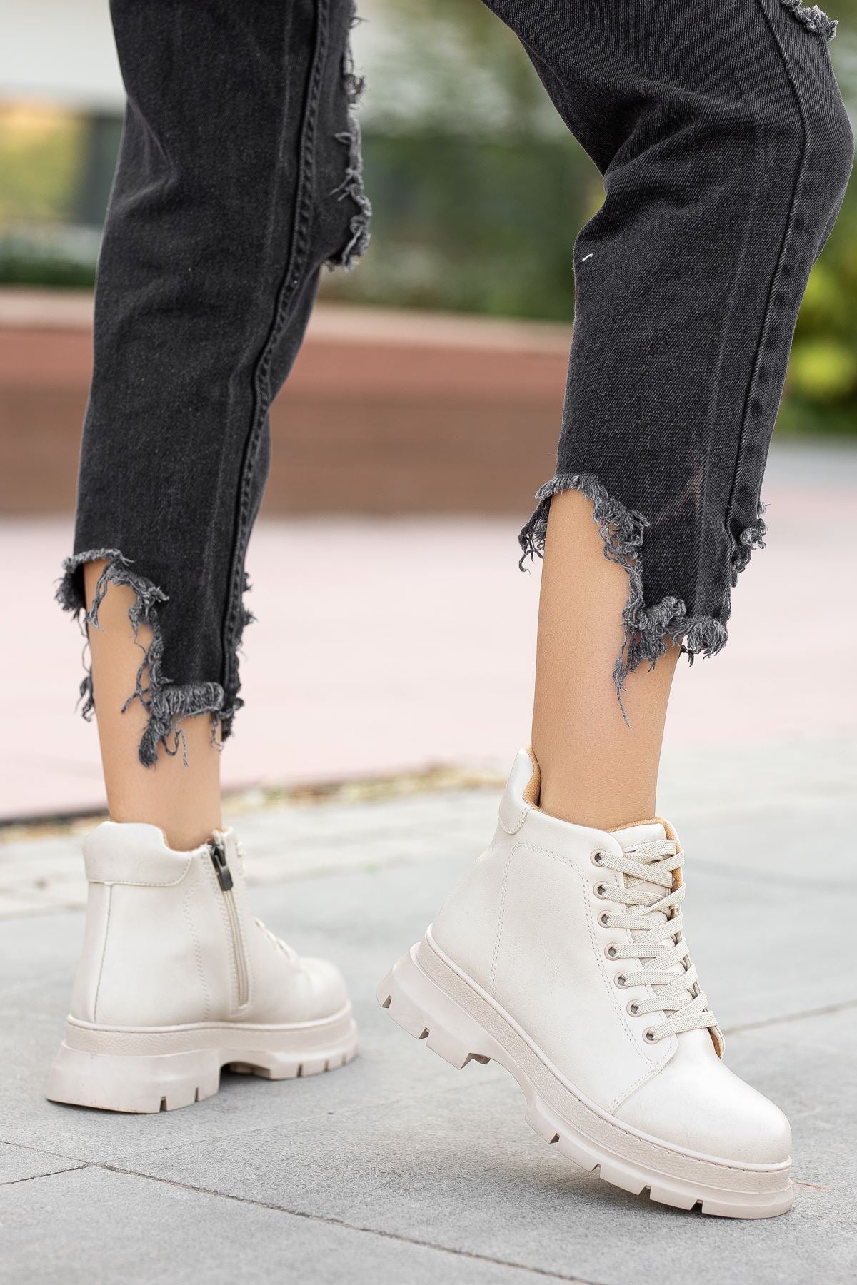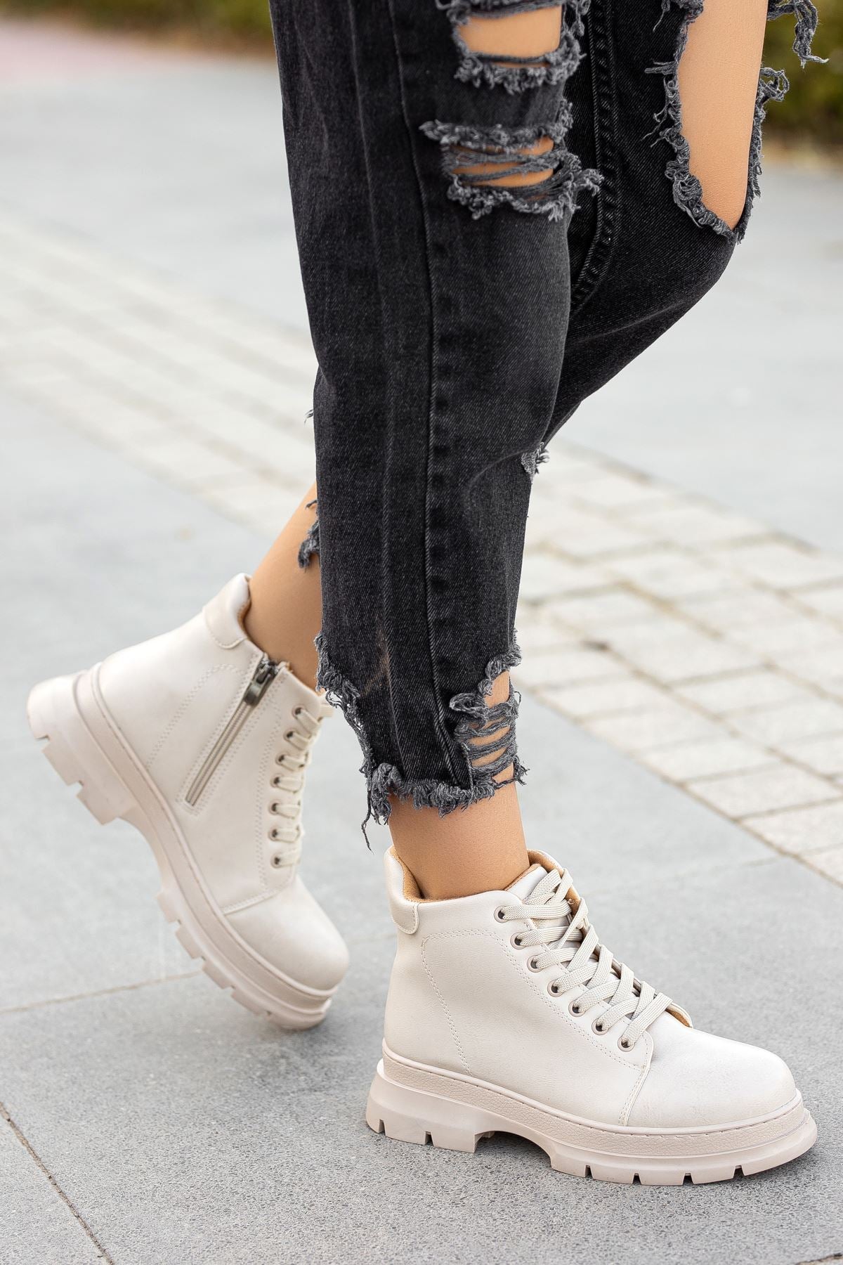 Cream Skin Short Lace Detail Women's Boots
