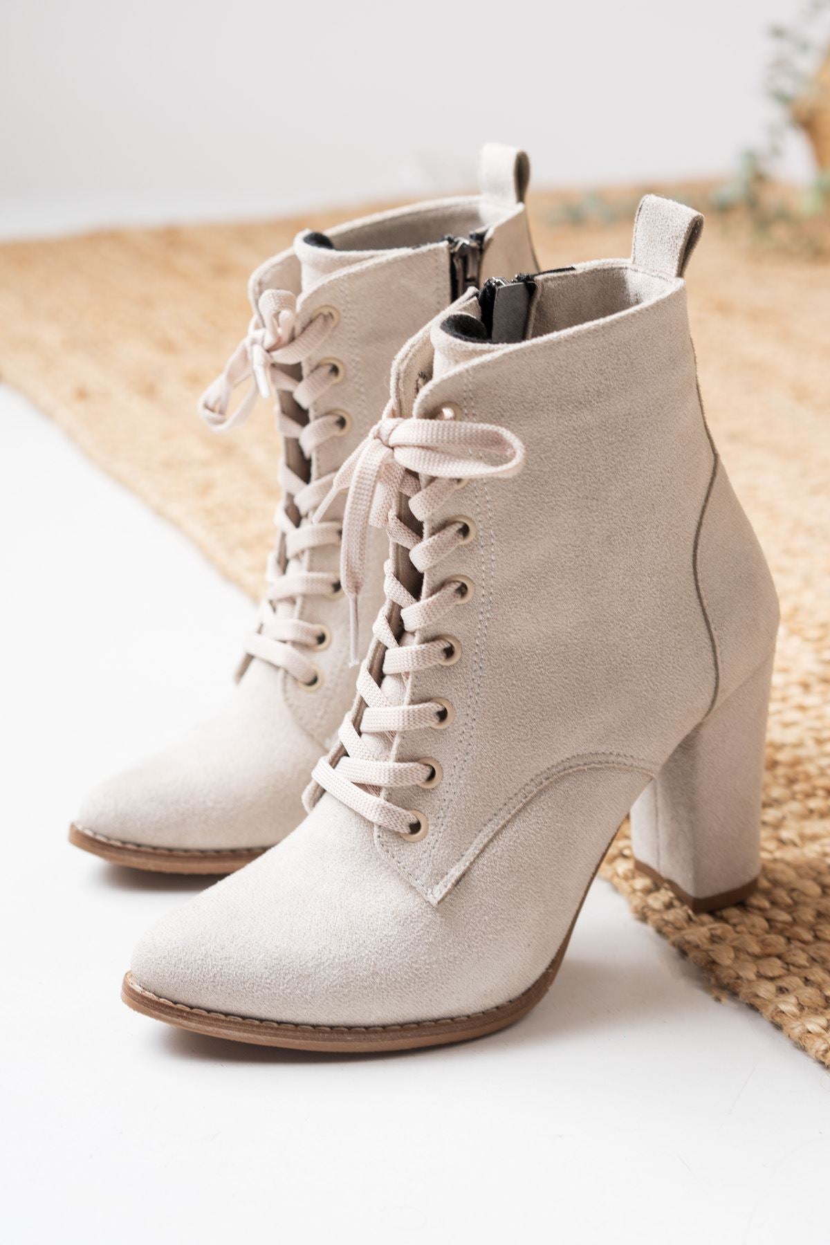 Cream Suede High Heel Lace-Up Detailed Women's Boots