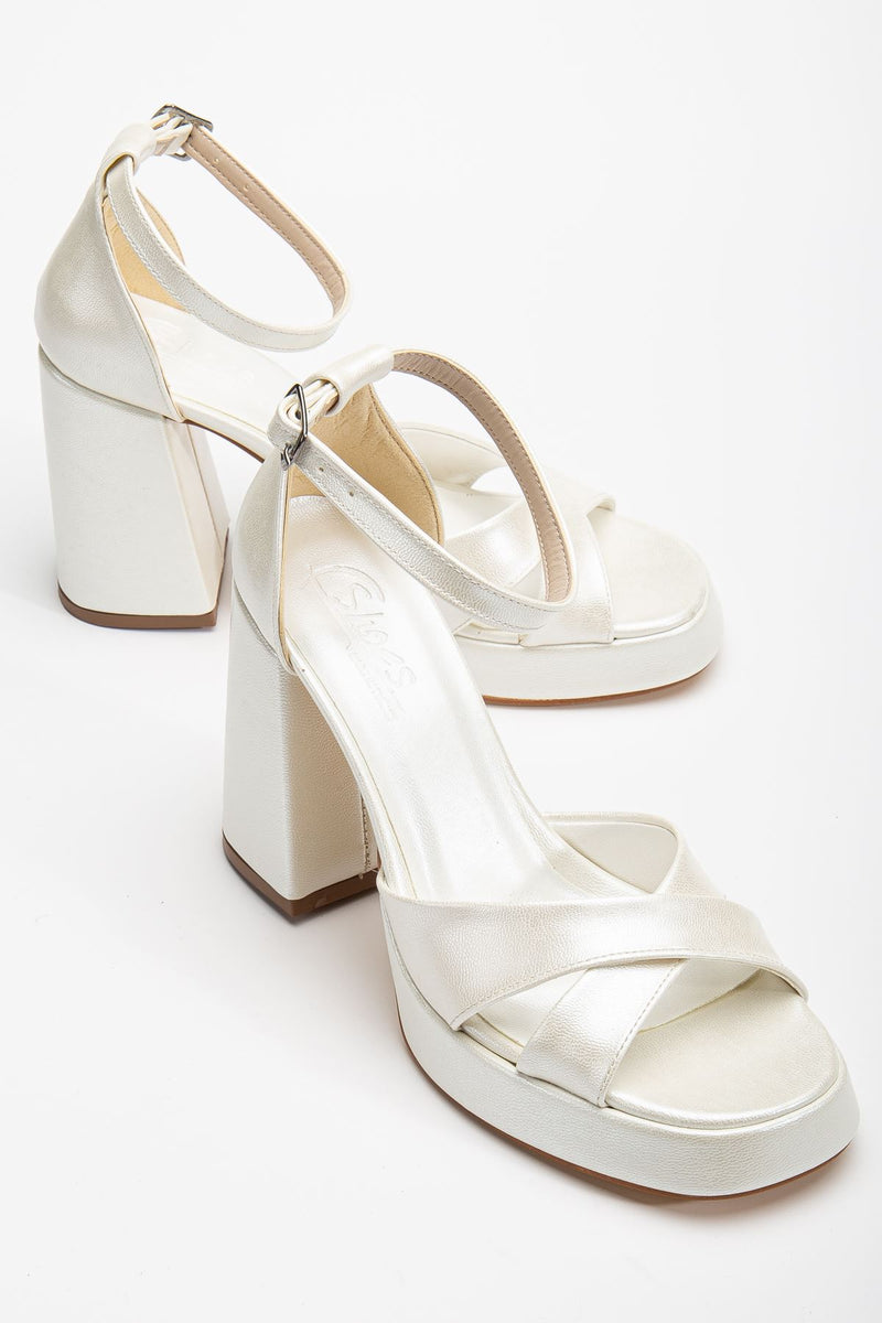 Women's White Mother of Pearl Leather Platform Open Toe Thick Heel Shoes