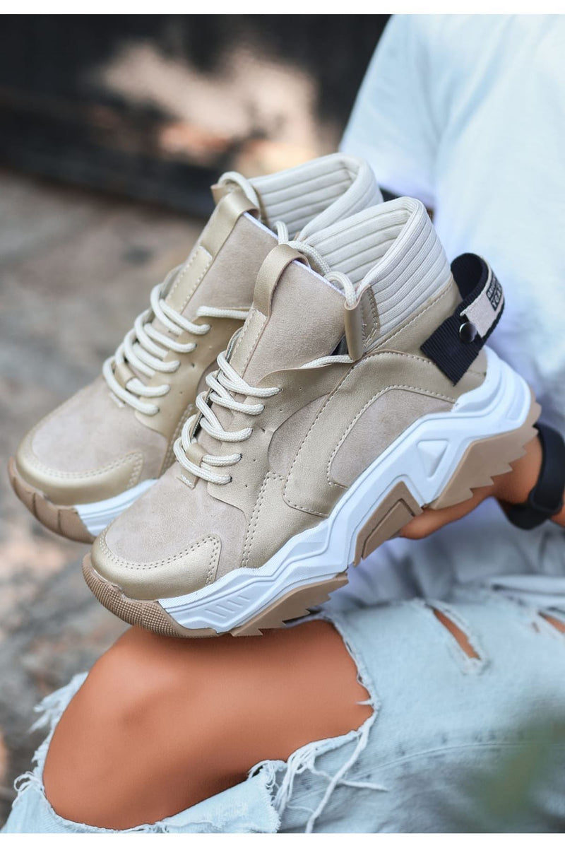 Women's Beige Leather Thick Soled Lace-Up Ankle Boots