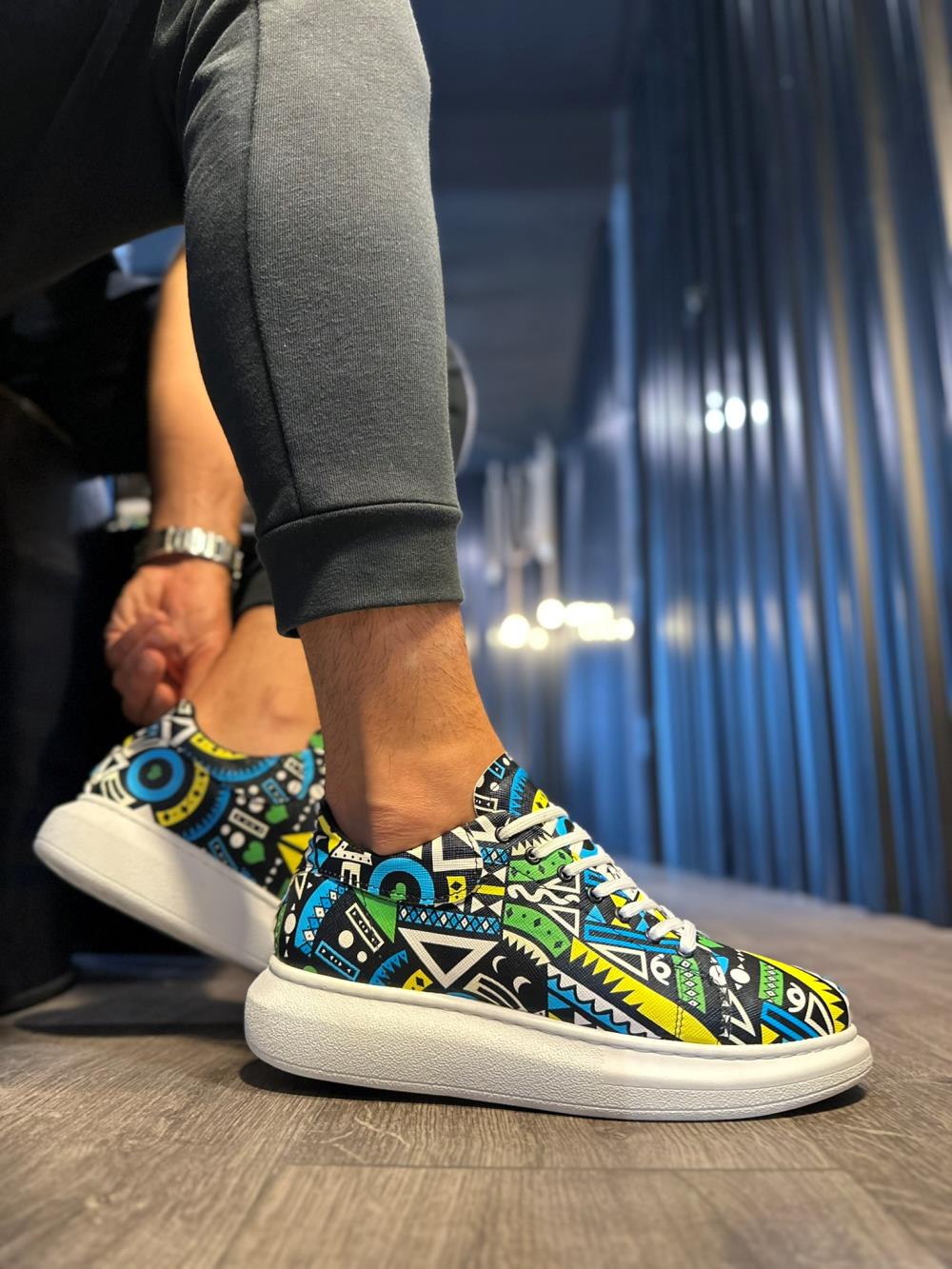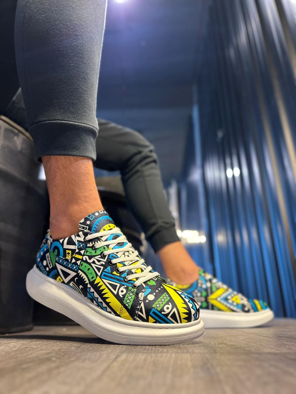 Men's High Sole Color Printed Casual Shoes 046 Yellow (White Sole)