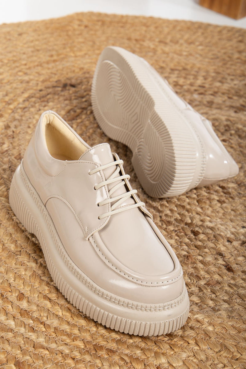 Women's Beige Patent Leather Casual Orthopedic Sole Oxford Shoes