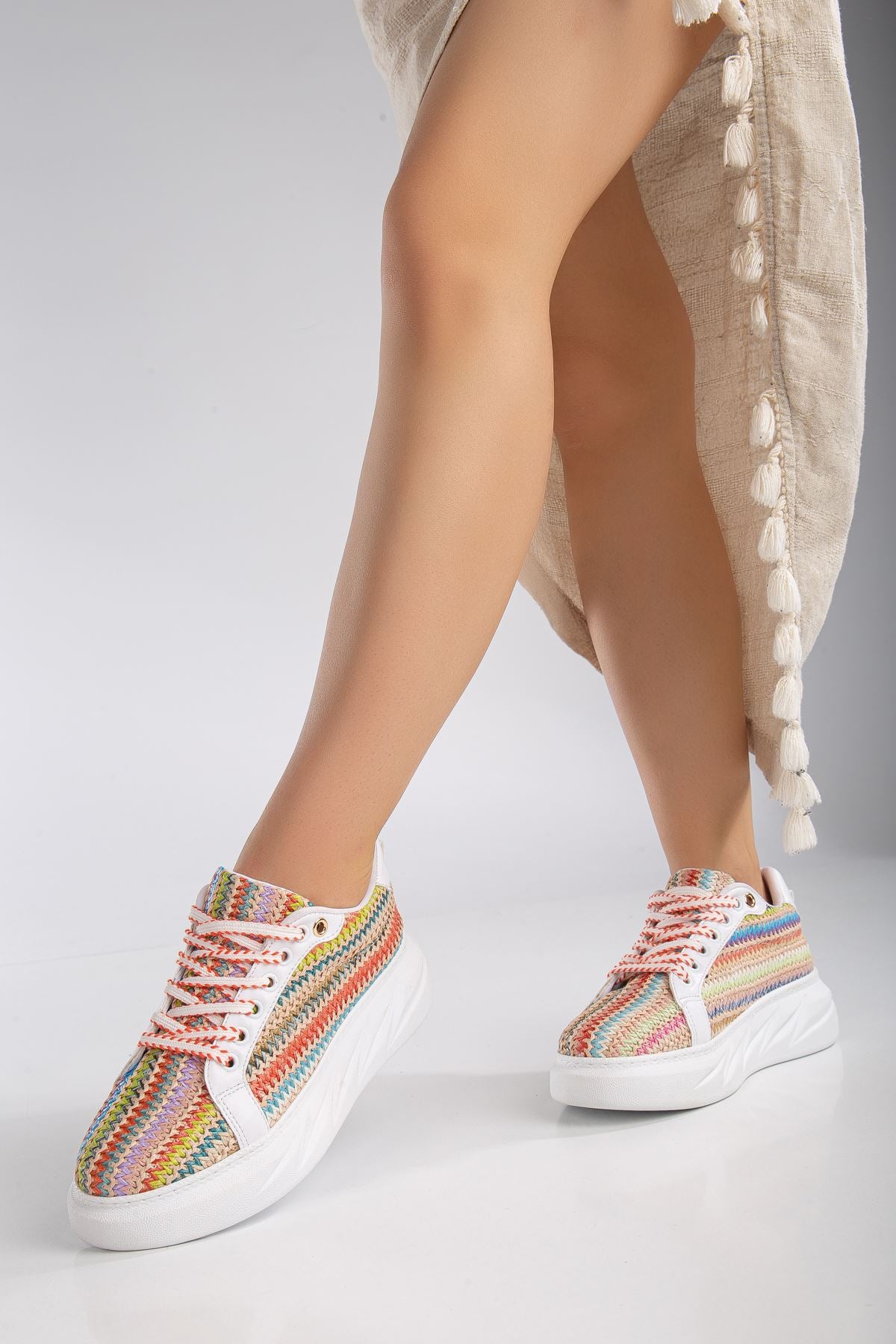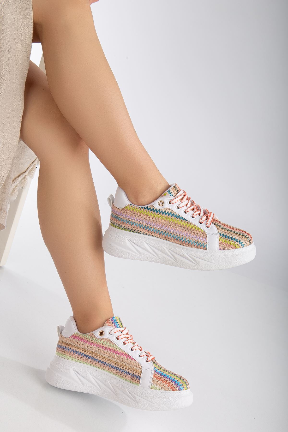 Women's Mavis White - Colorful Thick Sole Straw Detailed Sneakers