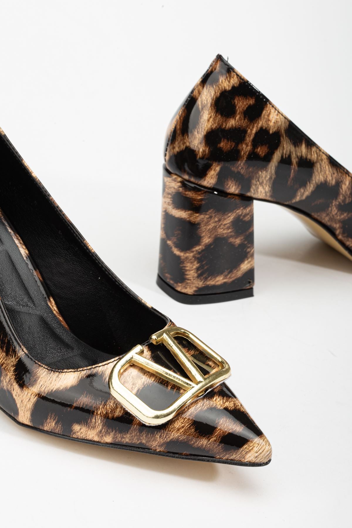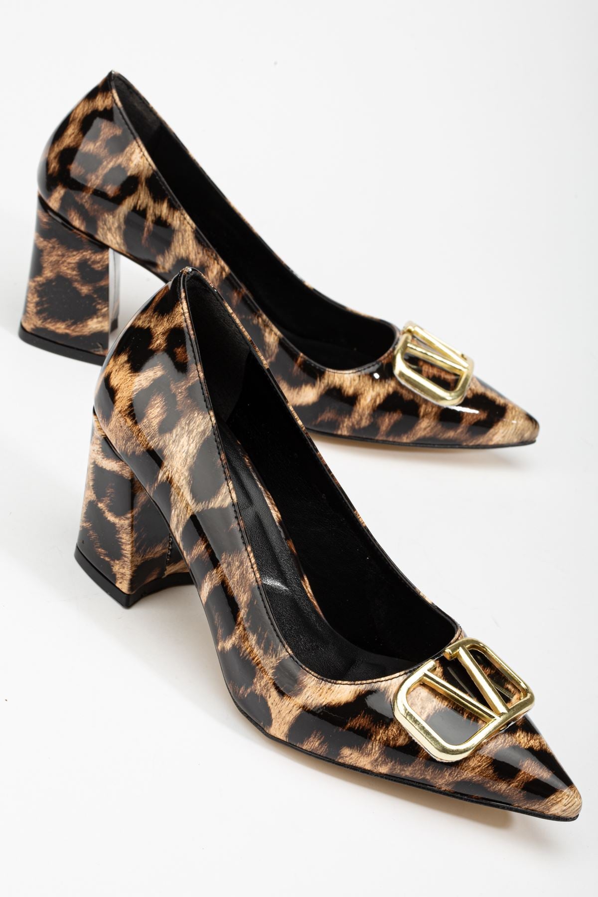 Women's Leopard Patent Leather Buckle Detailed Thick Heel Shoes
